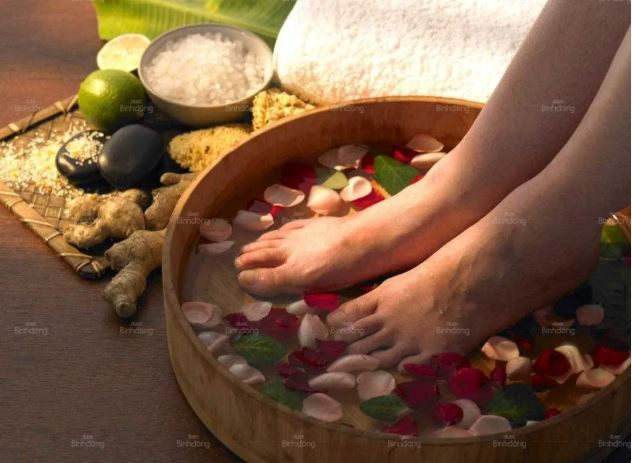 - Đặt hai bàn chân vào thau nước ấm, ngồi thoải mái trong khoảng 5–15 phút.